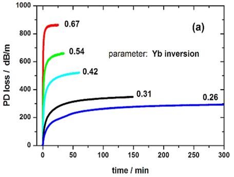 之前Koponen等人对光子暗化现象的研究表明光子暗化速度很大程度上取决于激发态镱离子的浓度,也就是镱离子的能态反转率(Yb inversion rate)。他们发现光子暗化速率同镱离子能态反转率的7次方成正比。在Fig 3中给出了在不同镱离子能态反转率条件下光子暗化损失随时间变化曲线。数据很直观地表明光子暗化率随着能态反转率的增加而急剧增大。