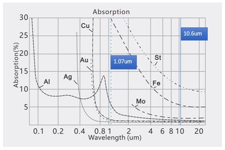 如今的大功率单模组光纤激光器早已能够轻松实现数KW级的光功率输出,这使得这类激光器在金属加工领域被广泛应用。在同等的光输出功率条件下,由于吸收率的不同,基于掺镱光纤的1微米光纤激光器比10微米的CO2激光器在加工金属材料时效率有显著的提升。Fig 1给出了不同金属材料的光谱吸收率,从图中可以看出大部分金属材料对光谱的吸收特性大致呈现出吸收率随着光波长增大而减少的趋势。金属材料对输出波长在1070 nm左右的掺镱光纤激光器相对于输出波长在10600nm的CO2 激光器明显更强。特别是金属铁在1070 nm波长条件下的吸收率比在10600 nm波长条件下提高了将近6倍。