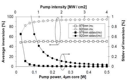 Fig 4 976 nm和920 nm泵浦条件下Yb 离子能态反转率随泵浦功率变化曲线