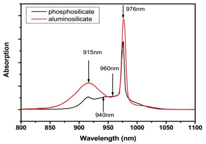 Fig 2, 铝硅酸盐和磷硅酸盐掺镱(Yb)光纤对800~1100 nm光谱的相对吸收率